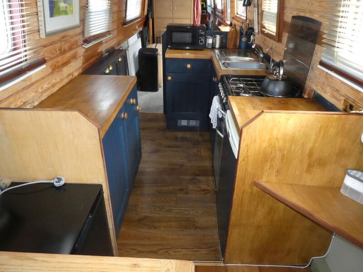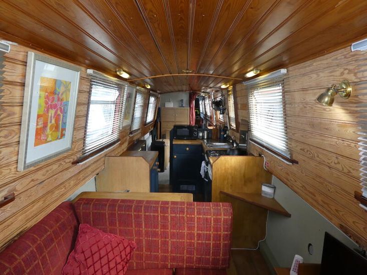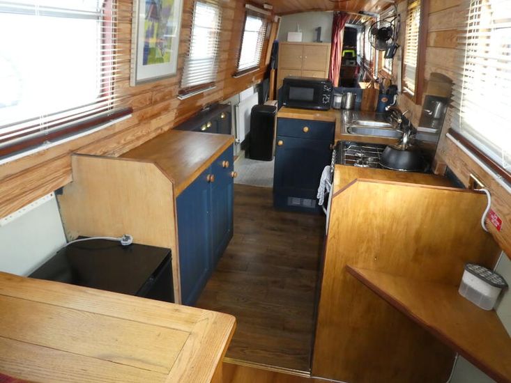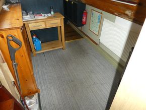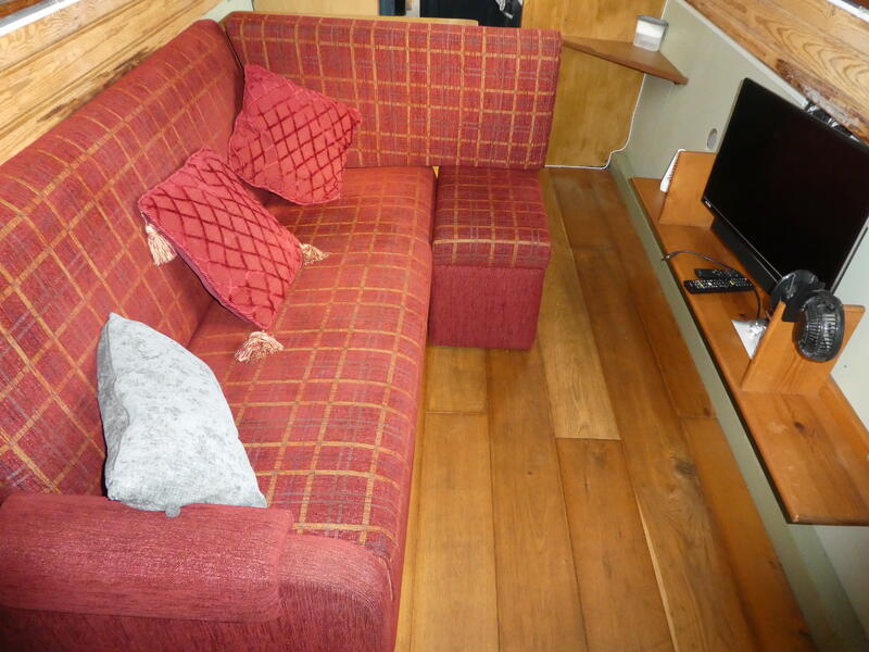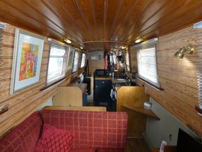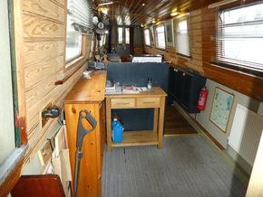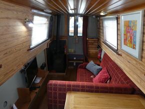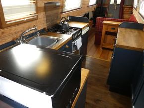 The saloon is entered through stable doors. In the saloon is an L shape sofa unit which will convert into sleeping for 2, multi fuel stove and free standing furniture.