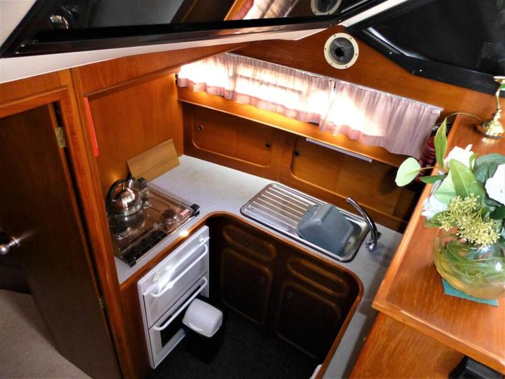 Forward of the saloon and down 3 steps, the galley lies to starboard with shower, hand basin and toilet to port. A door between the two gives access to the forward cabin which has V berths and wardrobe.