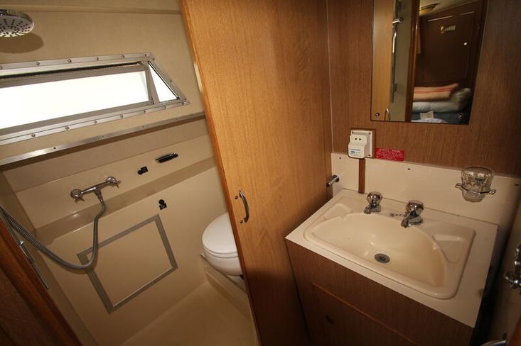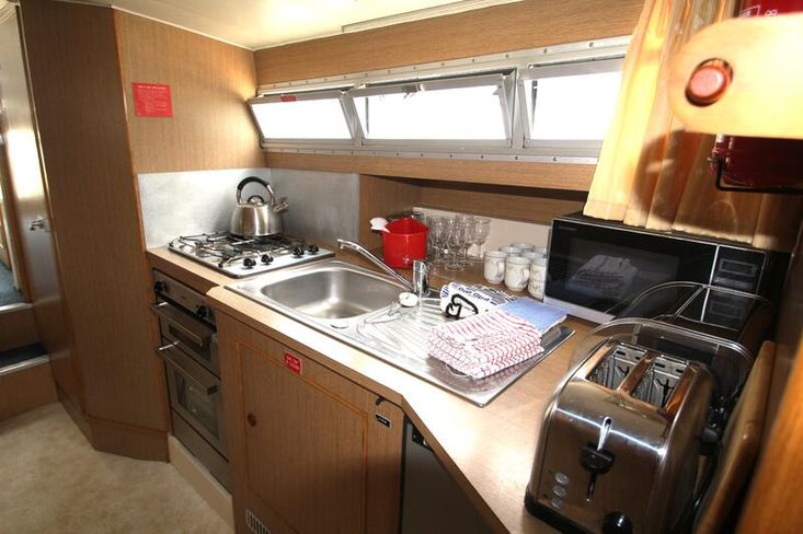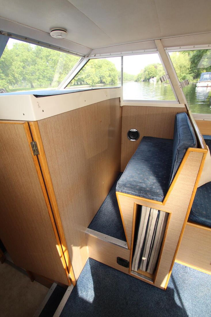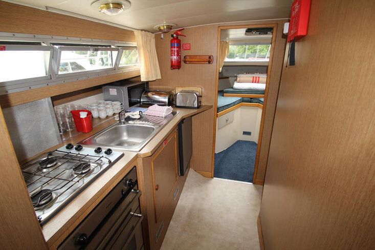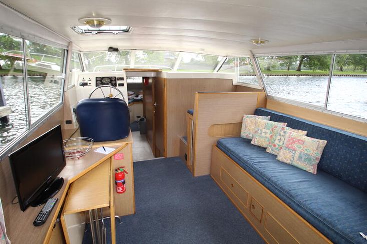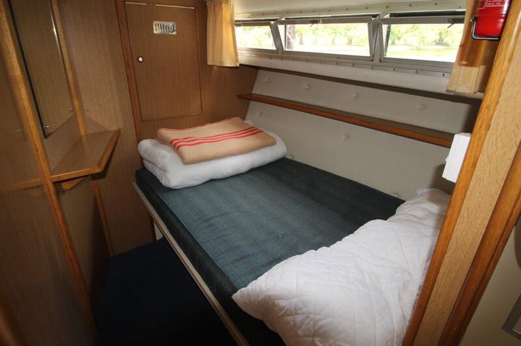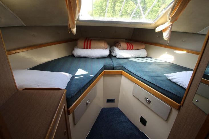 The front cabin has 2 fixed single beds which can be converted into a double bed. There are 2 draws, a cupboard and a wardrobe. The master double cabin has 3 draws and a full length wardrobe. The saloon sofa pulls out to make a double bed. There are 5 draws and 3 cupboards giving plenty of storage. The 3 cushions for the outside seating are stored under the seat opposite the helm. There is a 240v socket in each cabin.