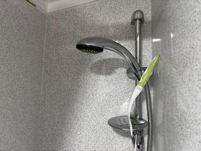 Shower tray and curtain with chrome thermostatic shower above