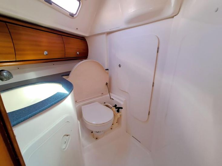 The Bavaria 32 offers two private double cabins – one forward, one aft – with an open and sociable saloon midships. The galley is positioned to port near the companionway, opposite the nav station. The heads compartment sits to starboard, aft of the saloon.