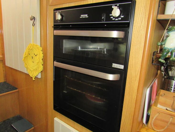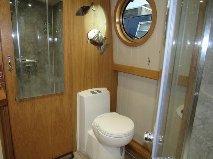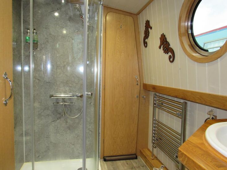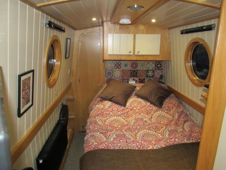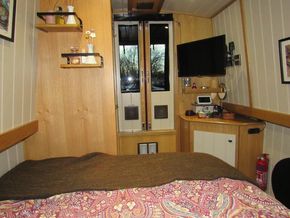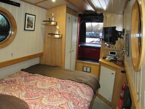 Finally there is the bedroom, including a fitted double bed with 3no draws below, extra storage behind these is accessed via the bed, 2 no overhead storage above the bed, a double wardrobe and an oak corner unit with 24" 12v TV with power outlet, flooring is grey heavy-duty carpet,1no double power socket, 2no 12v USB outlets, smoke/co2 detector, 1no fire extinguisher, glassed access doors to Well Deck.