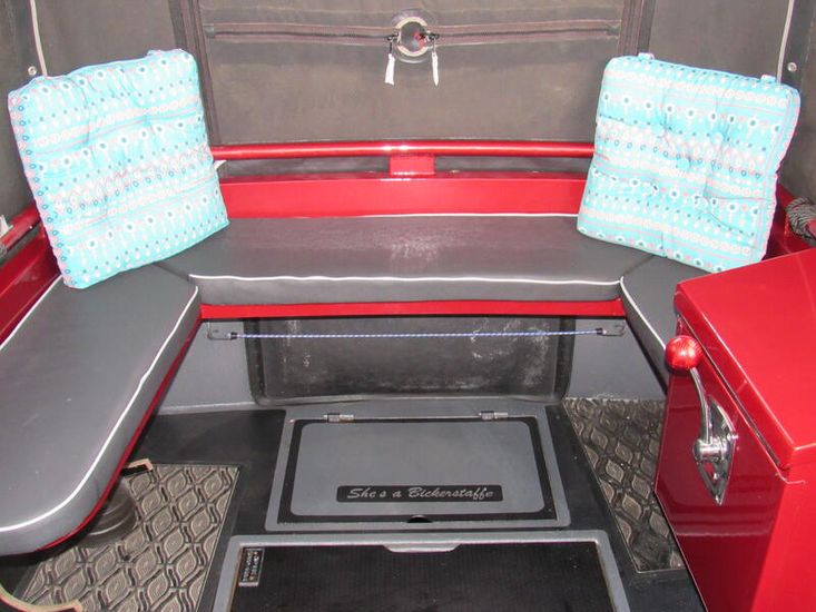 From the galley you walk into the Dinette which converts in to a double bed, additional storage is found under the Dinette seats. There are 2 duck hatches, both have internal glass windows/doors to allow natural light into the cabin area, 1 double power socket with USB ports. The upholstery for the dinette is a grey pattern finish, the flooring is grey heavy-duty carpet again with plinth lights.