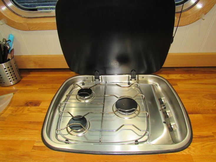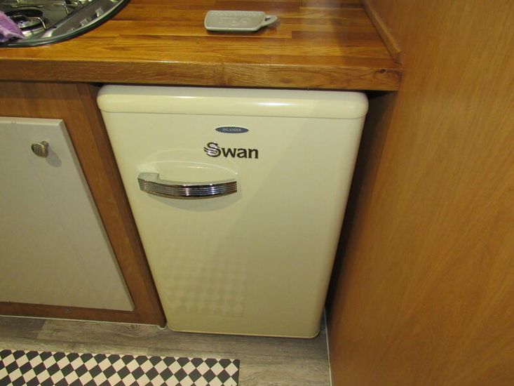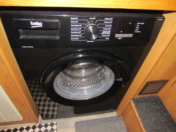 Once in the galley you will find eye level Thetford gas oven with separate grill, 700W microwave, Thetford 3 burner gas hob, Swan 12v fridge with ice box and Beko 6kg washing machine. The galley is finished with solid oak work tops with 2 double sockets, 1 with USB ports and a round sink and drainer with flexi mixer tap, there are 4 large under counter cupboards and 1 large cupboard with pull-out racking, there is also additional shelving, wine rack, fuse/control panel, 12v extract fan in ceiling, plinth lights, 1 no fire blanket & 1no fire extinguisher, smoke/Co2 detector, the flooring is grey vinyl.