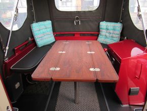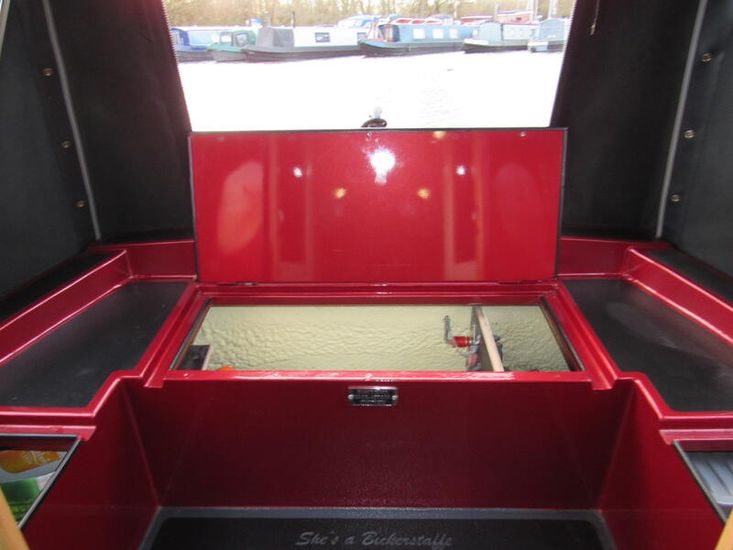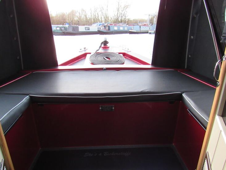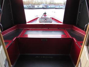 She is a square cruiser stern with wrap around benches, two storage lockers (one gas) either side of stern doors, all have detachable cushions, there is a bespoke oak table, for alfresco dining which folds for easy storage, control panel with 12V & USB sockets, shoreline plug socket, access to the engine bay, weed hatch.