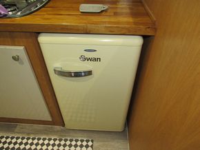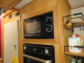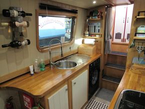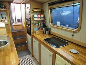 From the stern you go down the steps into the galley, 2 of the steps lift to give access to the under step storage area which also contains the 6o Litre calorifier, either side of the steps are 2 large storage cupboards which contain the Vetus 3kw inverter and the expansion tank for the HW & heating system.