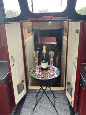 Next is the salon which again is carpeted in grey heavy-duty carpet, in the salon we have a grey 2-seater couch, a 32” smart tv with timber surround and a Morso Squirrel solid fuel fire with black tiled base and surround, a movable storage/shelving unit, book shelf and 3 corner shelves with access door to the Thetford Toilet cassette below, plinth lights, 2no double power outlets, 1 no 12v outlet, Wi-Fi router (sim card not provided) 1no fire extinguisher.