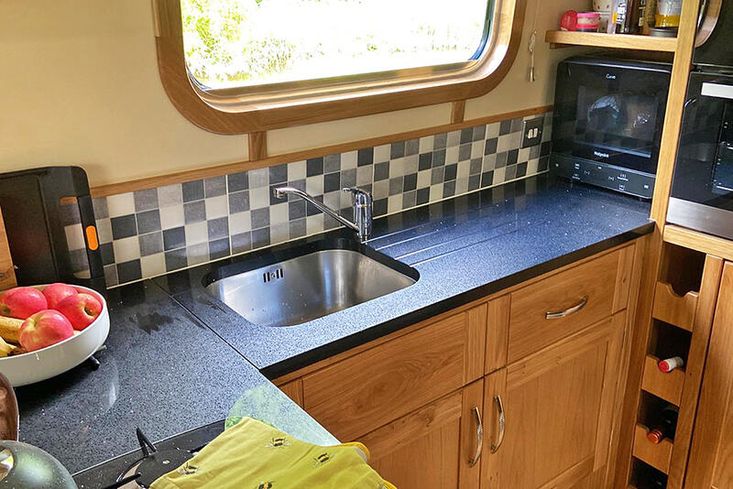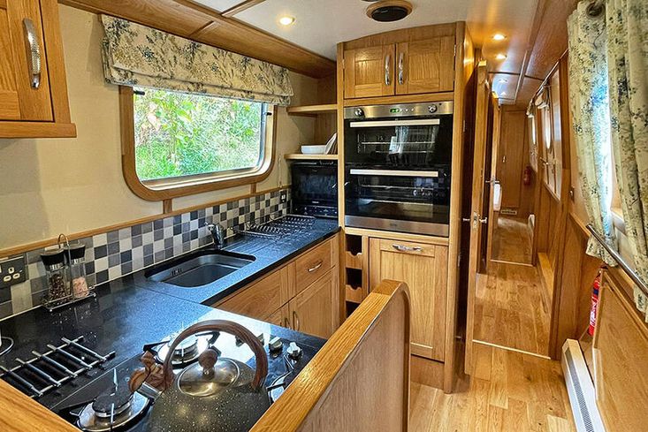 Galley: A spacious Galley, with the full domestic sized gas oven and grill, separate four burner gas hob, fridge/freezer, 230v microwave, a dishwasher and granite worktop.