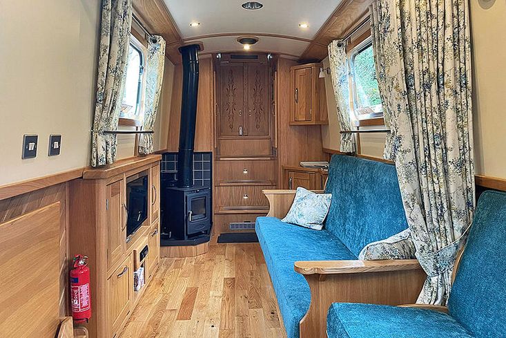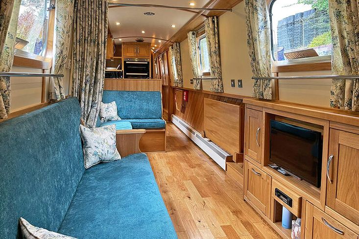 Saloon: The saloon has comfortable built in seating that converts to beds and a wood burning stove. There is a built in flat screen TV, a DVD player and Radio / CD player.