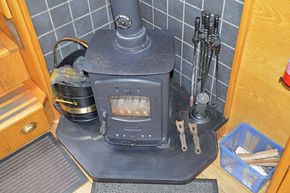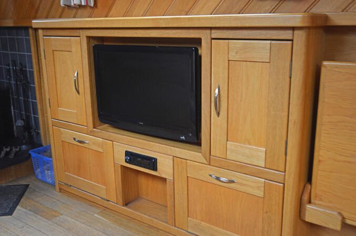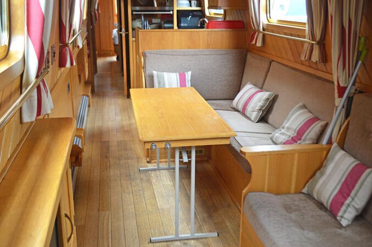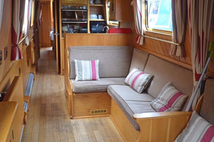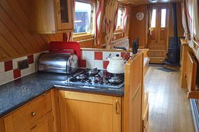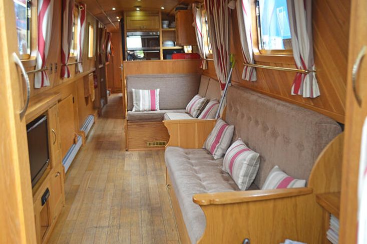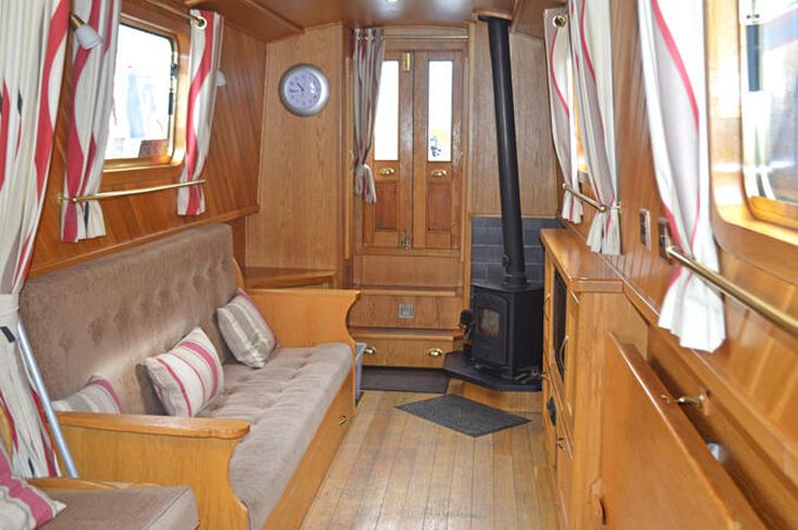 Saloon: The saloon has comfortable built in seating that converts to beds and a wood burning stove. There is a built in flat screen TV, a DVD player and Radio / CD player.