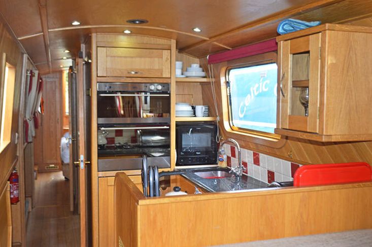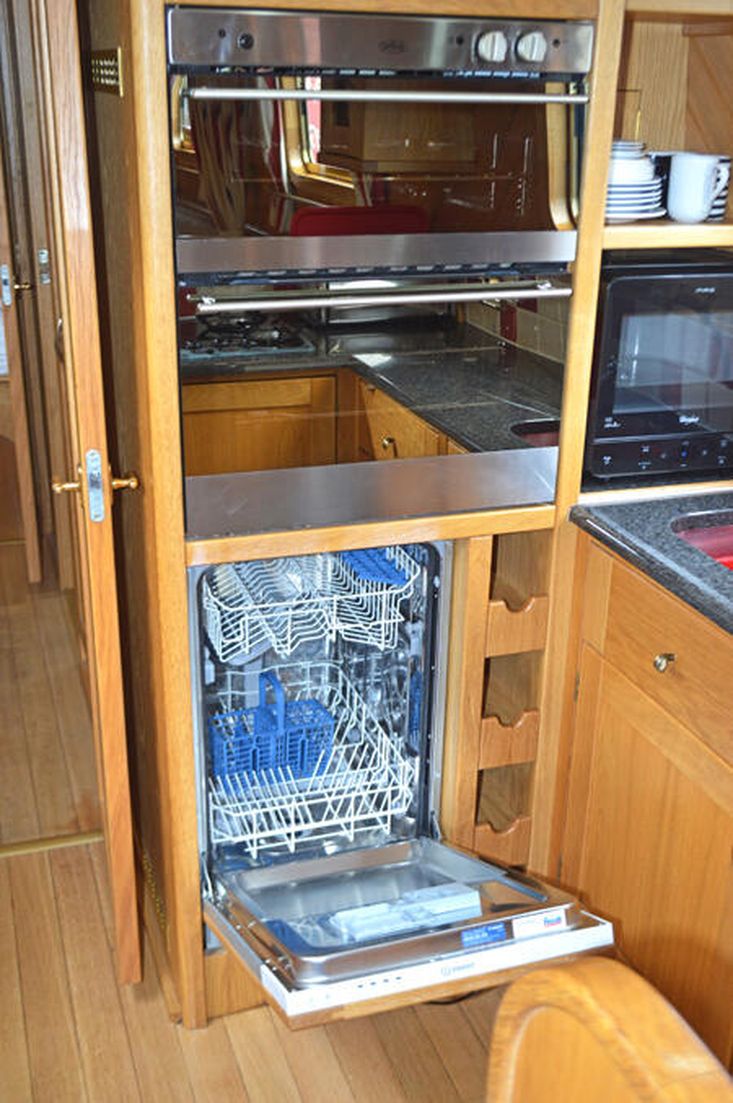 Galley: A spacious Galley, with the full domestic sized gas oven and grill, separate four burner gas hob, fridge/freezer, 230v microwave, a dishwasher and granite worktop.
