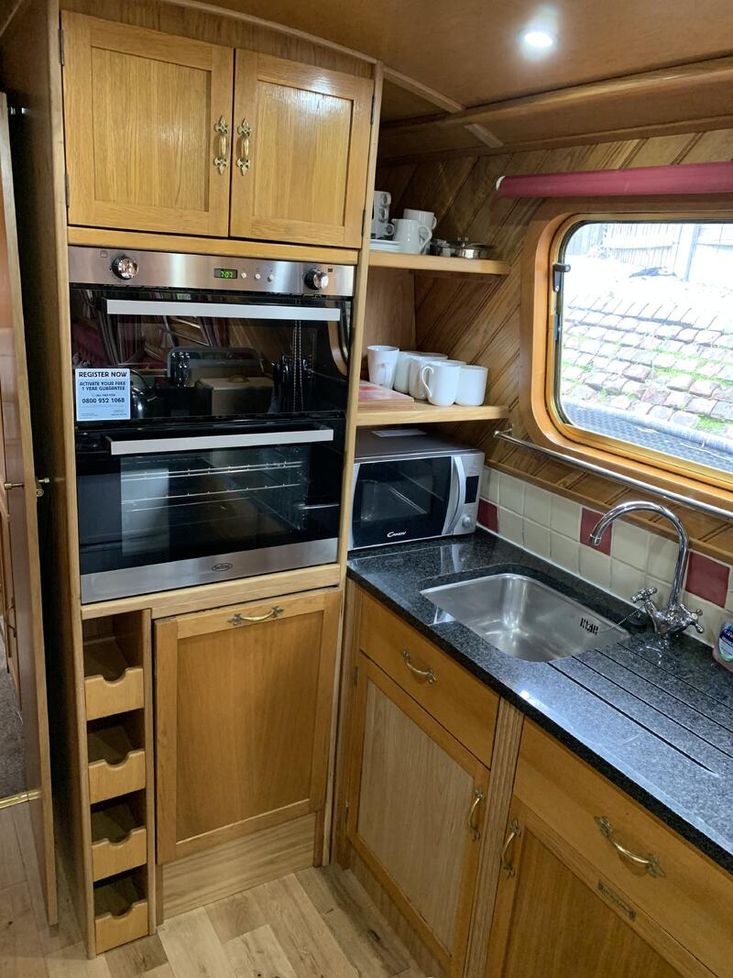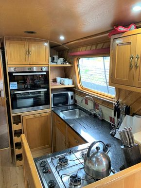 Galley: A spacious Galley, with the full domestic sized gas oven and grill, separate four burner gas hob, fridge/freezer, 240v microwave, a dishwasher and granite worktop.