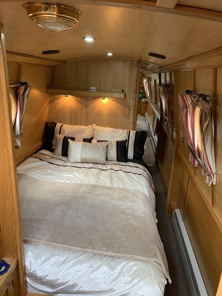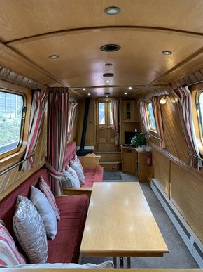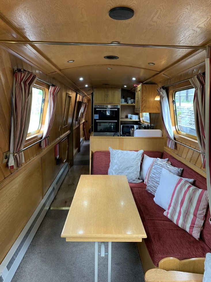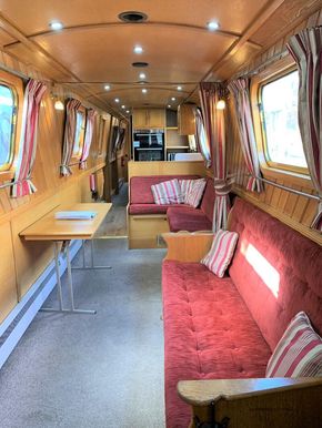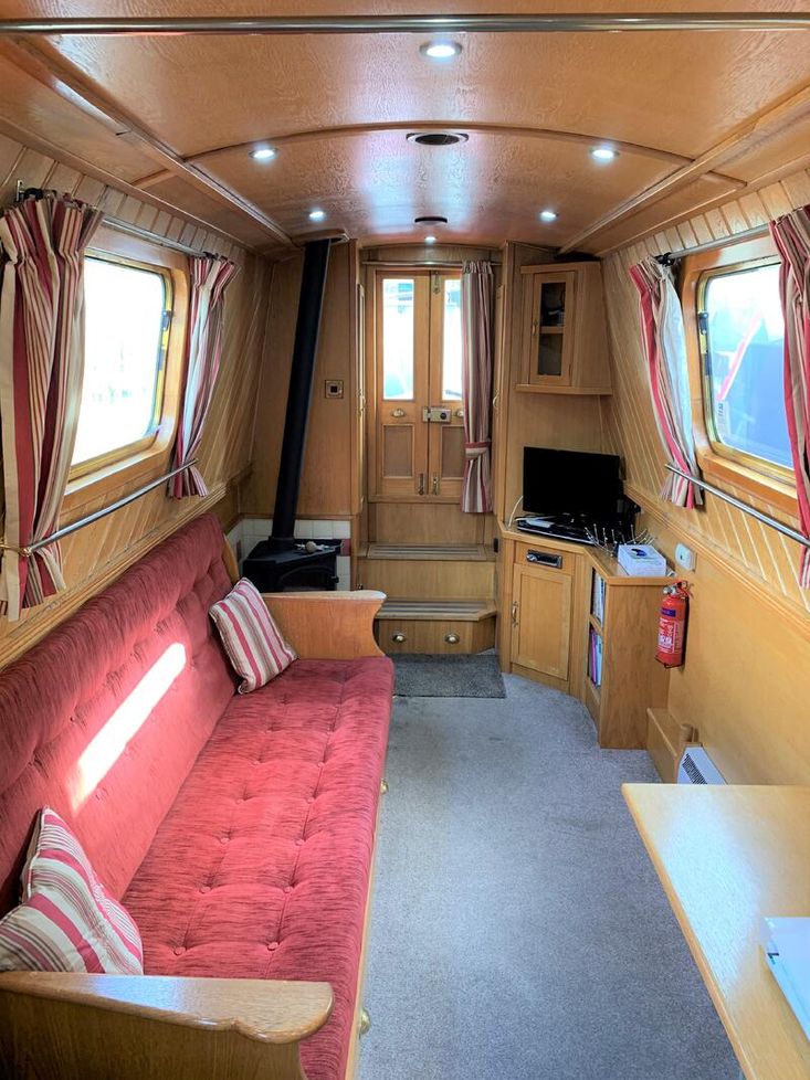 Saloon: The saloon has comfortable built in seating that converts to beds and a wood burning stove. There is built in flat screen TV, a DVD player and Radio / CD player.