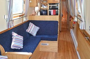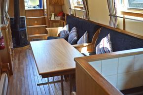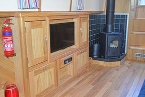 Saloon: The saloon has comfortable built in seating that converts to beds and a wood burning stove. There is a built in flat screen TV, a DVD player and Radio / CD player.