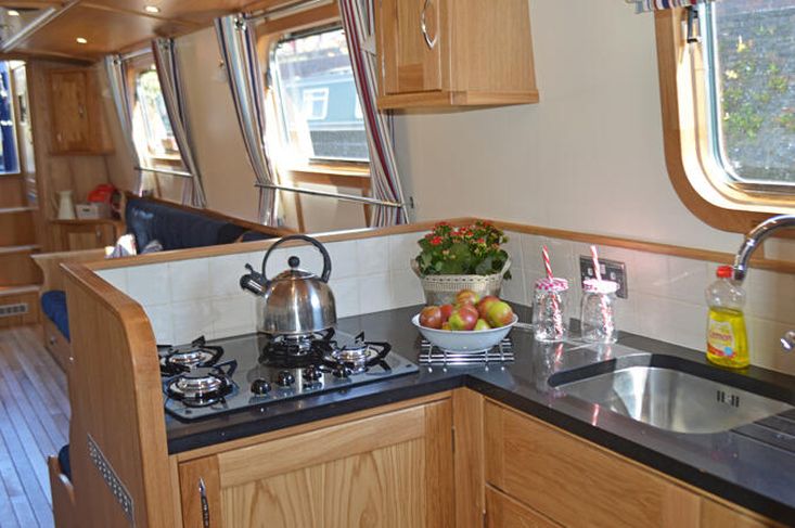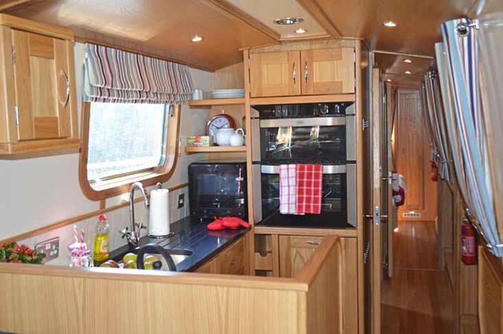 Galley: A spacious Galley, with the full domestic sized gas oven and grill, separate four burner gas hob, fridge/freezer, 230v microwave, a dishwasher and granite worktop.