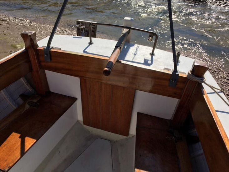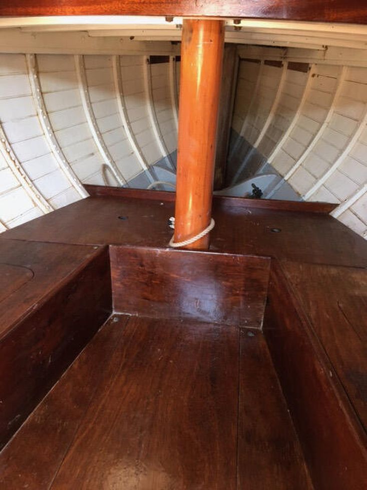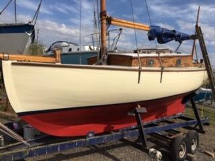 17-foot, with bowsprit 20-foot overall, 6-foot-6 beam, 2-foot-9 draught. Carvel built, larch on oak frames, long keel, massive ballast, red sails (main and jib, 14 m2 approx), all running rigging renewed 2023 in top maritime tradition. Cabin with grab rails, can sleep two, no creature comforts. 4 x brass-framed portholes. Bracket for outboard: Mercury 5 hp 4-stroke available extra. Good inventory for local pottering in tidal waters: e.g. CQR and kedge anchors with chain, warps, fenders, jackstays. No electrics. (Hand-held VHF radio and GPS available extra.) Trailer OK for yard work, not for highway.