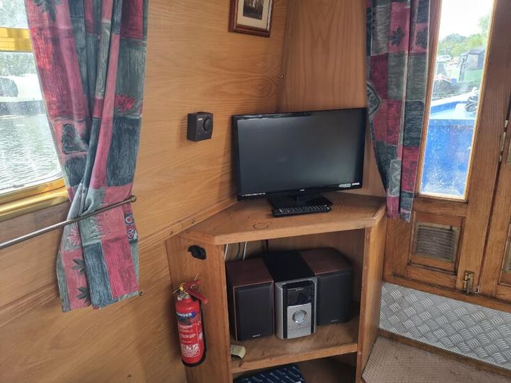 The main cabin has L shaped fixed seating with storage under and also makes into a 3/4 double bed. There is a folding dining table, corner storage cabinet & a central heating radiator.