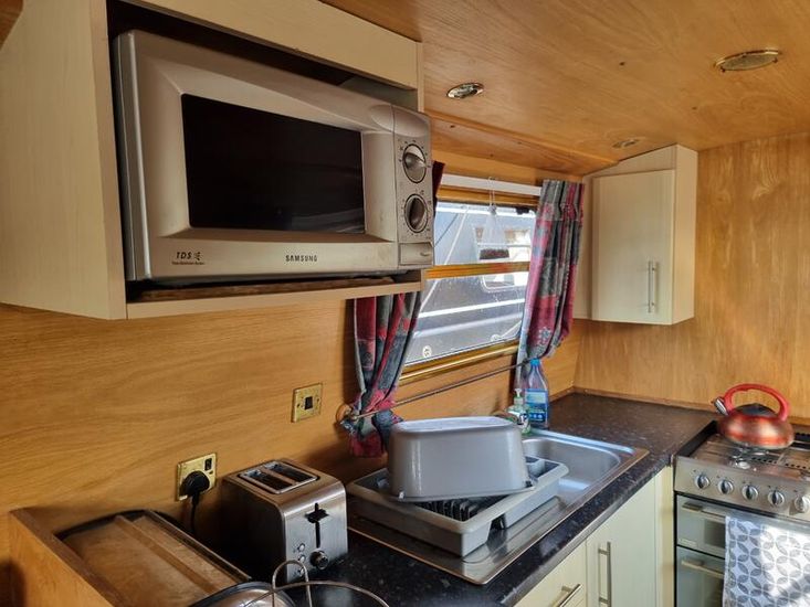 The galley has a four ring gas hob, oven & grill, stainless steel sink & drainer, fridge, toaster, microwave oven, ample work-top & cupboard space.