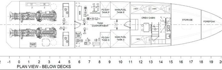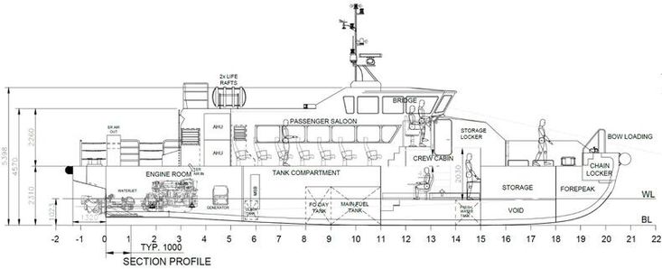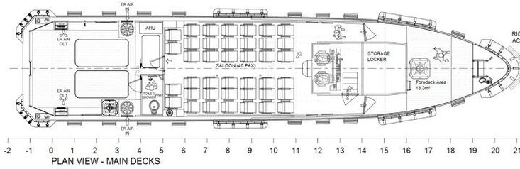 Vessel : Passenger Transfer Vessel Classification : +Hull ? Mach, Light Ship, Fast Crew Boat, Sea Area 3. Passenger : 40 pax (Non-reclining). Crew : 03. Constructed Material : Aluminium. Speed : 25-26 knots. Cruising : 23-24 knots. Main Engine (Twin) : CAT C18 ACERT,‘C’ Rating / 533 kW (715 hp) per engine.