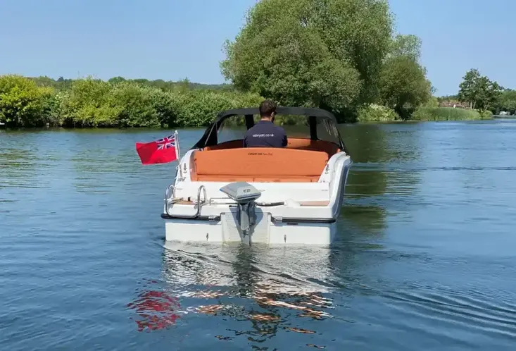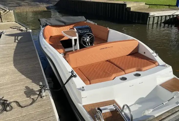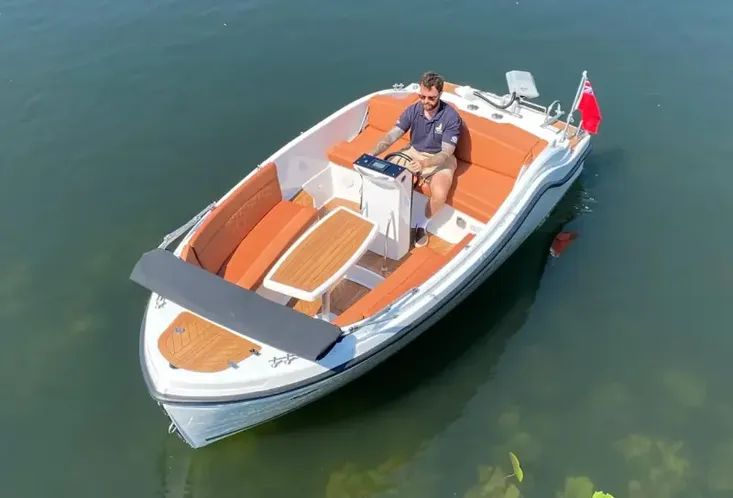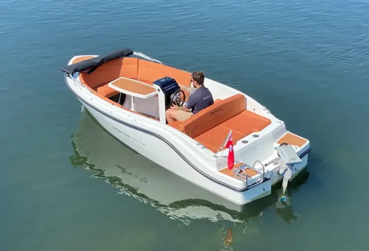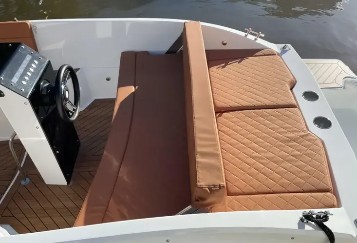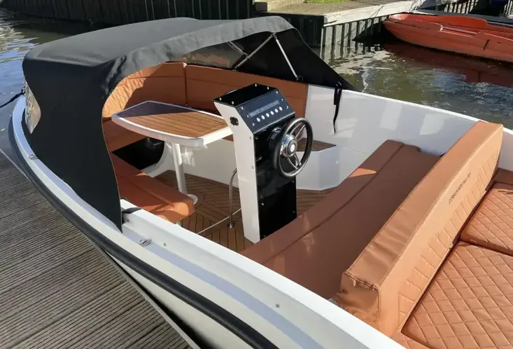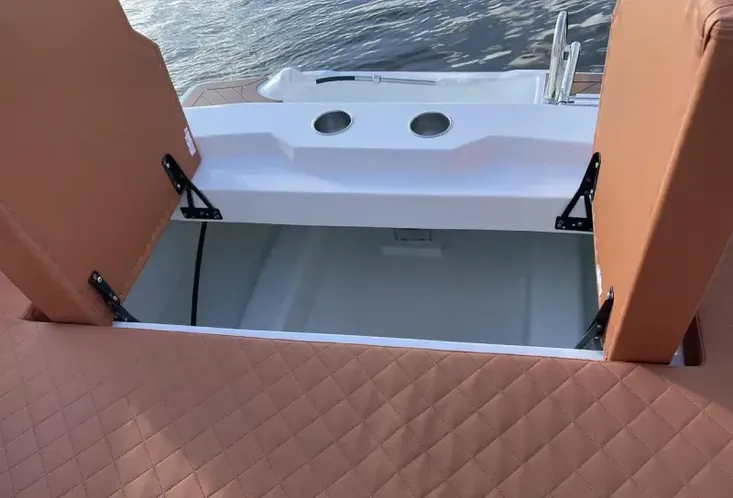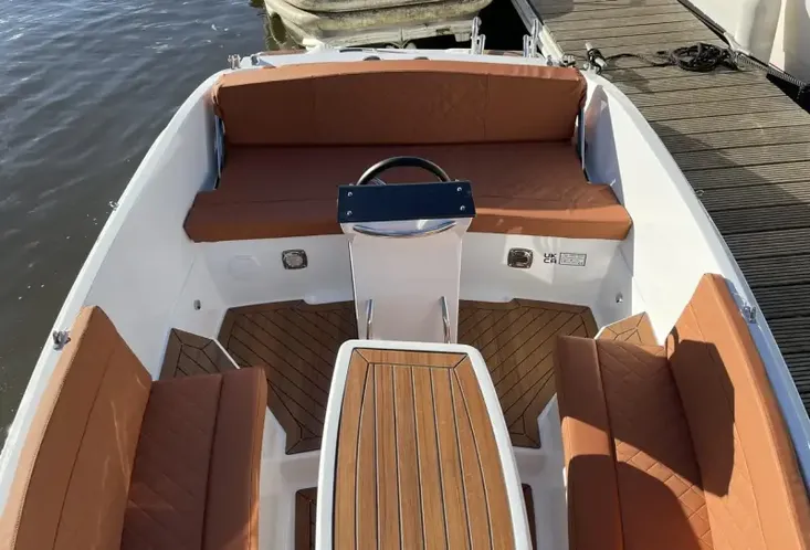 This boat is ideal for those looking for sporty tender styling with space and practicality. The central helm pedestal makes the cockpit spacious and easy to move around. There is an excellent amount of under seat storage and the table easily lowers and converts to a forward sunpad. The large aft deck cushion with flippable backrest will also make a popular space to lay out on sunny days.