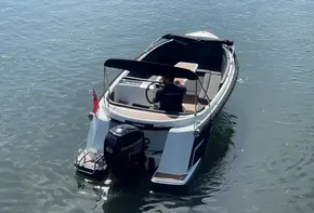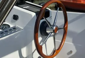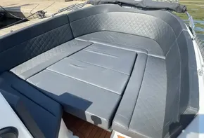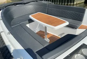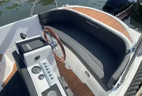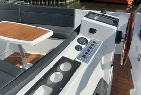 The steering console is cleverly integrated into the port side, providing ample seating around a table, with storage lockers beneath. The outboard is housed within the moulded bathing platform, which protects the engine and facilitates transom access.
