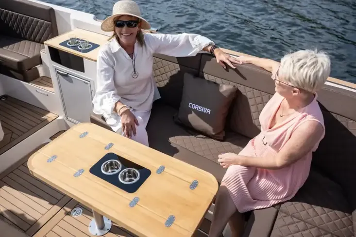 Its clever design provides an abundant amount of storage both under the hinged seat bases and behind the back rests. The option of a 120 litre fuel tank allows for much longer cruising. With a maximum engine size of 175hp, this model of Corsiva is suited for both inland and coastal use.