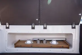 - Water system (water tank with tap, basin and transom shower)