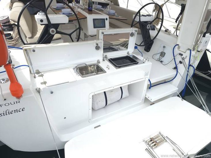 Cockpit spacieux et convivial – L’un des plus grands de sa catégorie, avec des pavois hauts, table de cockpit pliante, coffres profonds et plateforme de bain escamotable. Module arrière innovant avec plancha et évier pour profiter pleinement de la vie en extérieur.