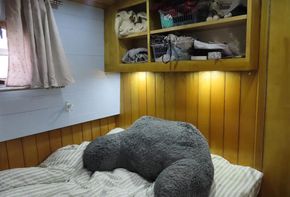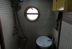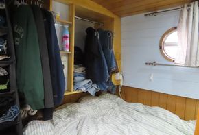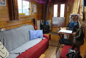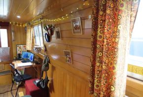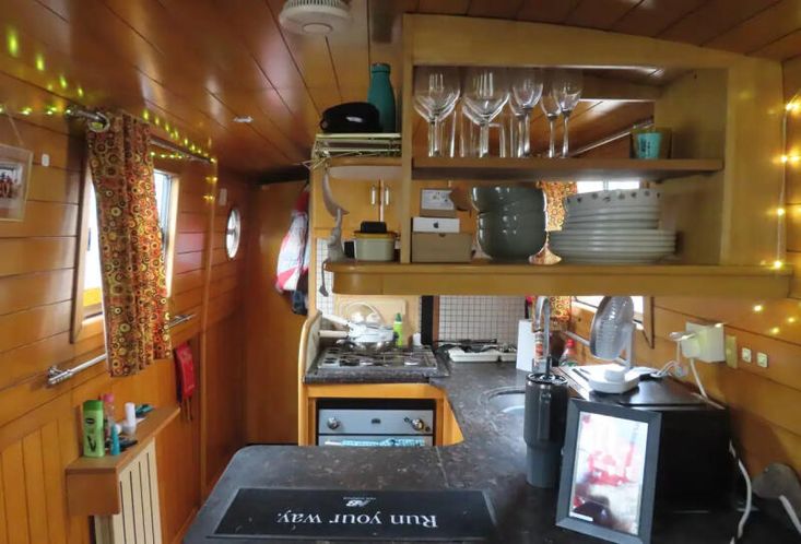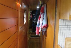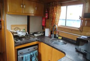 Entering from the bow, T’Blikje’s open plan saloon and galley is a deceptively spacious, warm and light living area. Her saloon features a solid fuel stove and built in sofa and her current owner also regularly works from home and has therefore commissioned a marvellous, bespoke, solid wood desk which folds neatly away. Her fitted galley is fully equipped and offers generous work top areas and storage space.