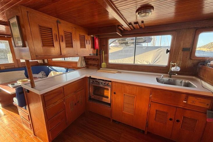 Powered by twin Ford Lehman 120-hp engines, the boat delivers a comfortable cruising speed of 7.5 knots. With 1600 L of fuel and 1,000 L of fresh water, this Eurobanker is equipped for long cruising or simply a day out sailing with friends.