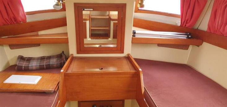 Cockpit teak faced table stowed under aft cabin deckhead with collapsable aluminium legs stowed on rear shelf