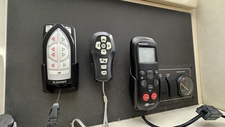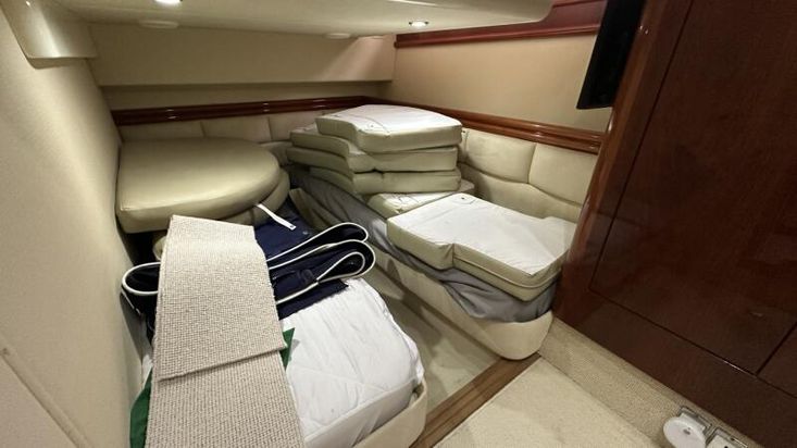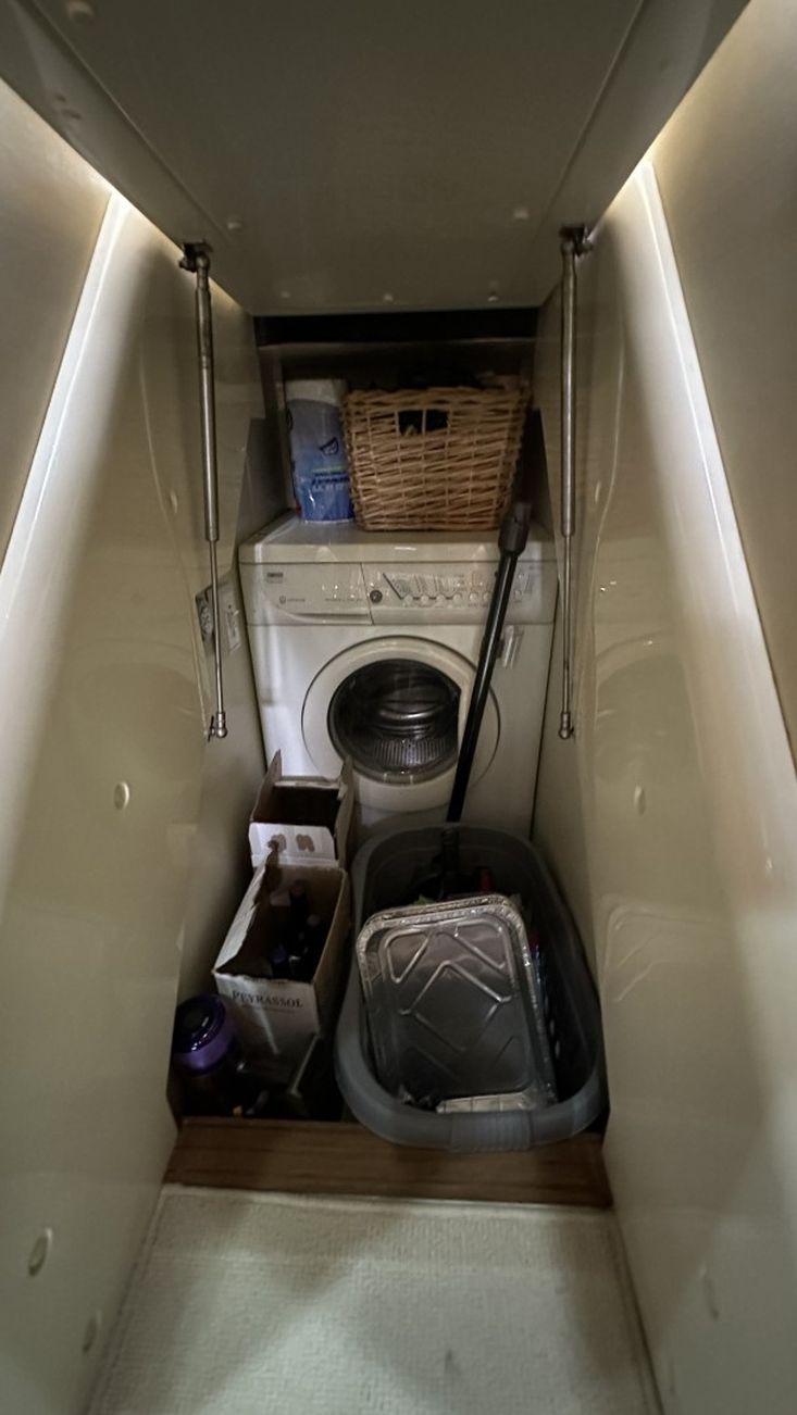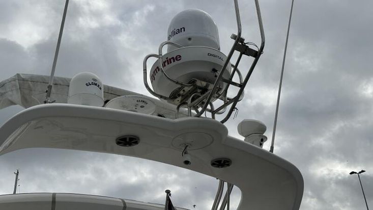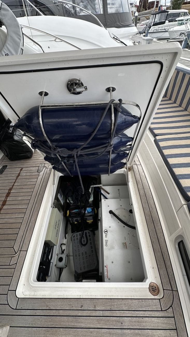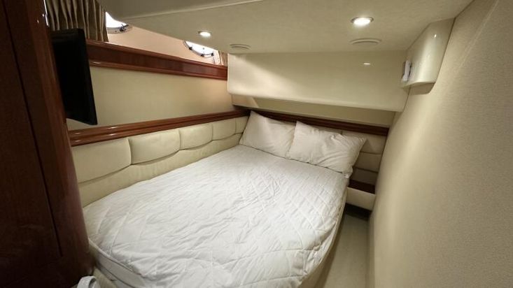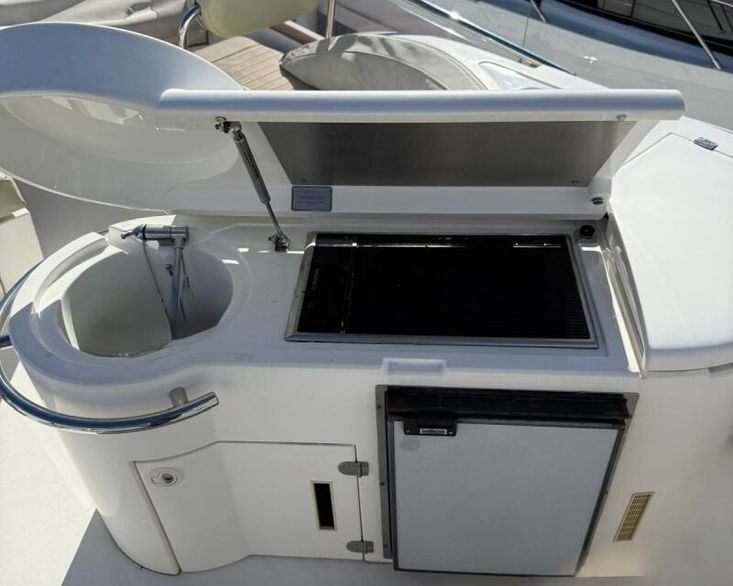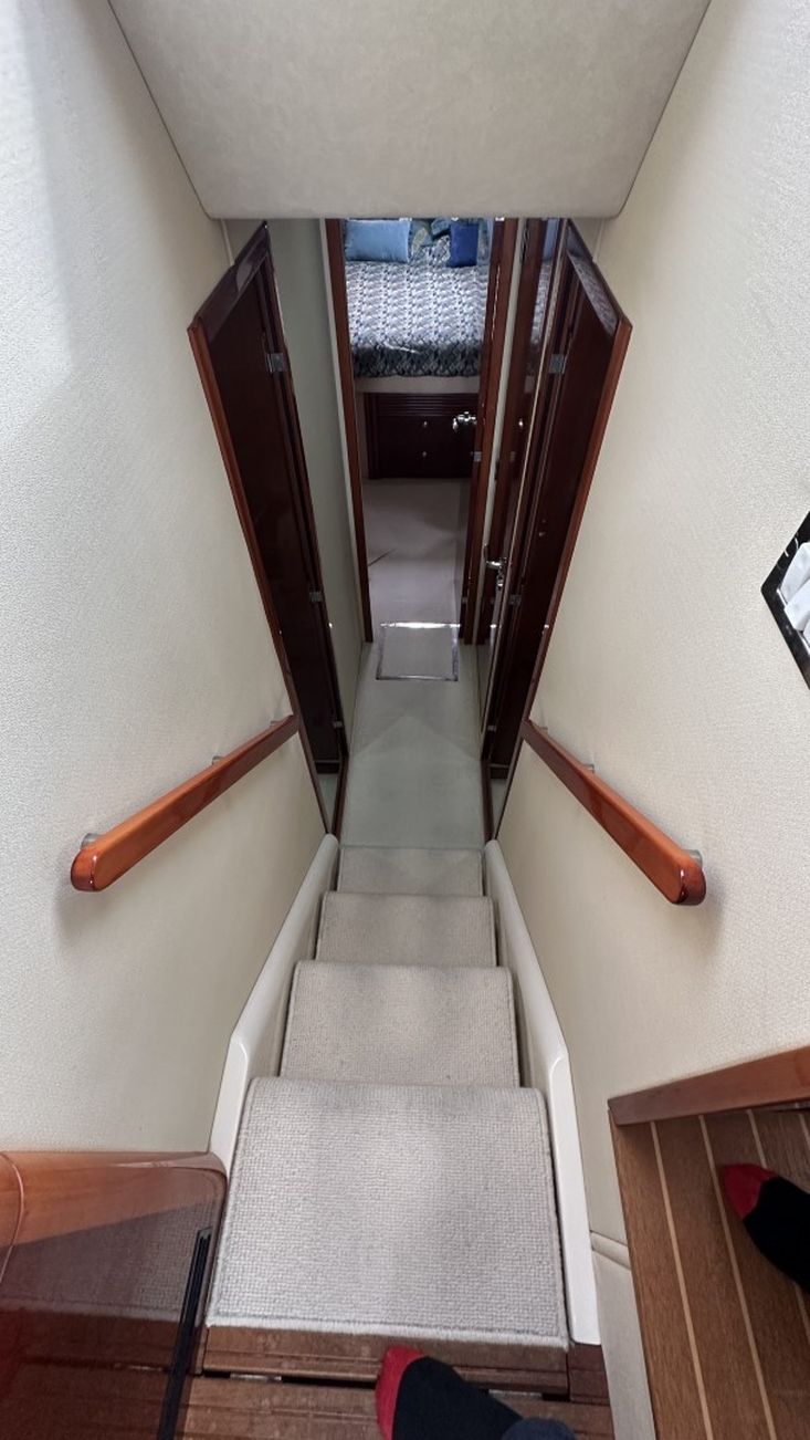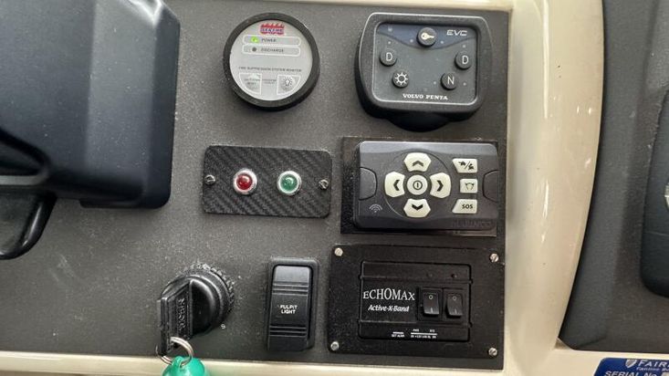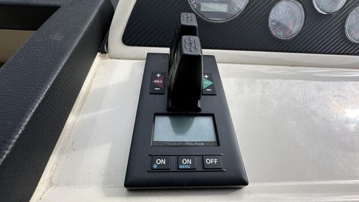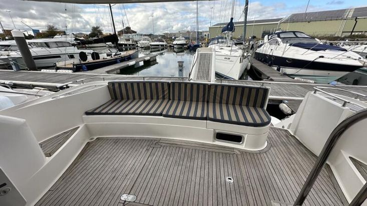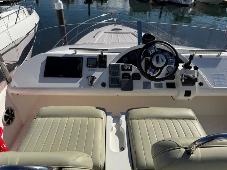 Volvo Penta D12-715 engines on shaft driveProportional thrust bow & stern thrusters with remote controlPassarelleOnan generatorReverse cycle air conditioning throughoutRaymarine navigation equipment, including autopilot & radarRear view cameraEchomax active radar reflectorSpotlightSatellite TV systemBOSE 321 surround sound systemWashing machineNew saloon TV on hi-lo systemFwd cabin TVGalley dishwasherMicrowave/Combi oven in galleyCeramic hob in galleySaloon fridge in lieu of icemakerCherrywood interiorIvory leatherFlybridge biminiFlybridge tonneau cover (new, unused)Flybridge BBQ, sink & fridgeVacu-flush headsChaincounterCrew cabinUpgraded Fusion stereo and speakers