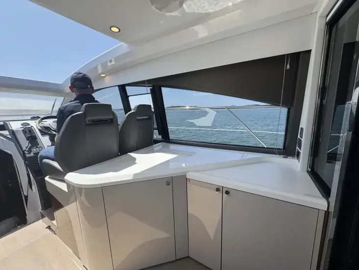 - Starboard side bar area with integrated fridge, glass storage drawer and additional storage areas