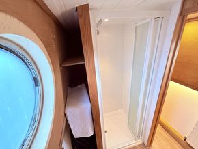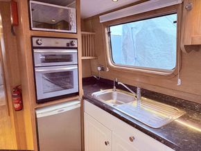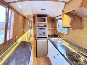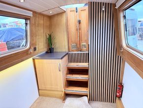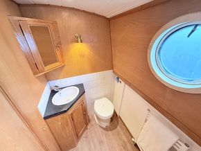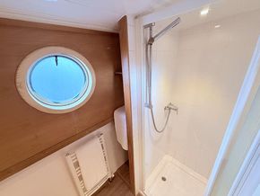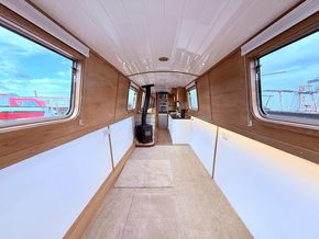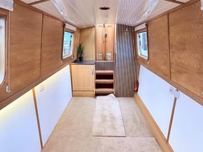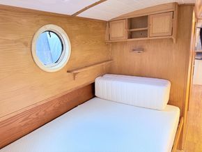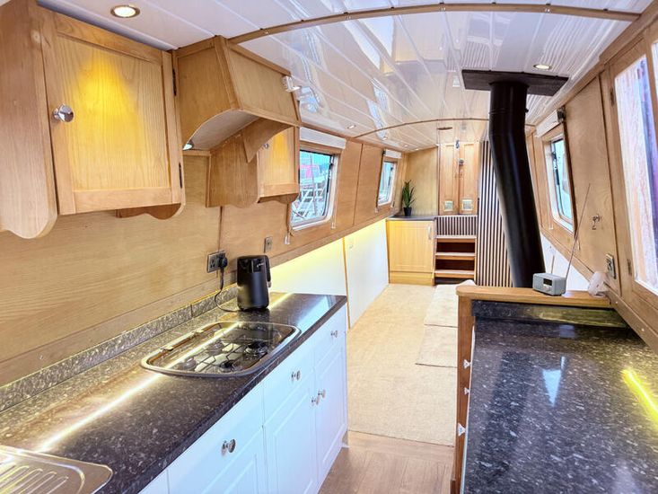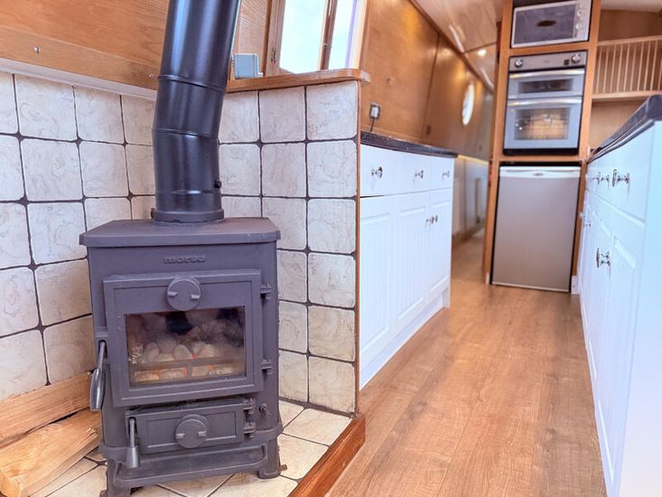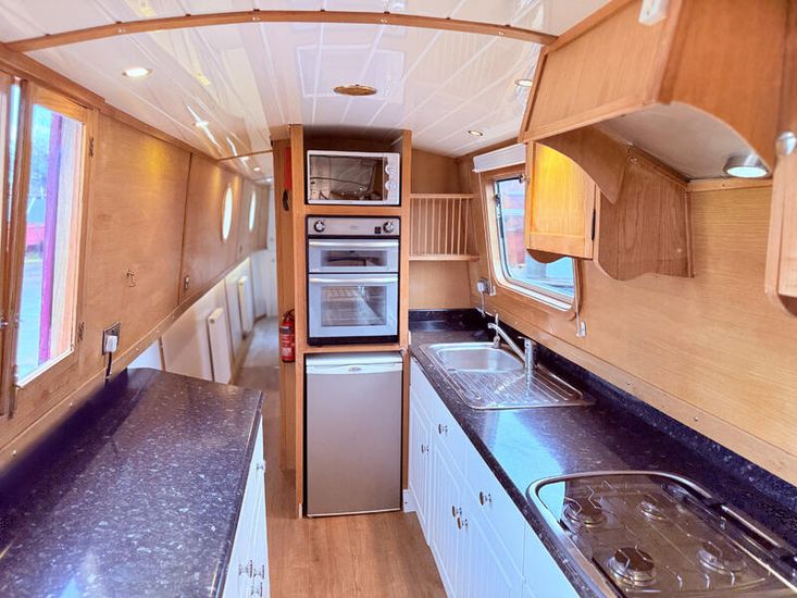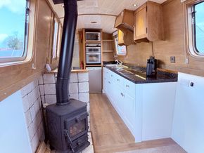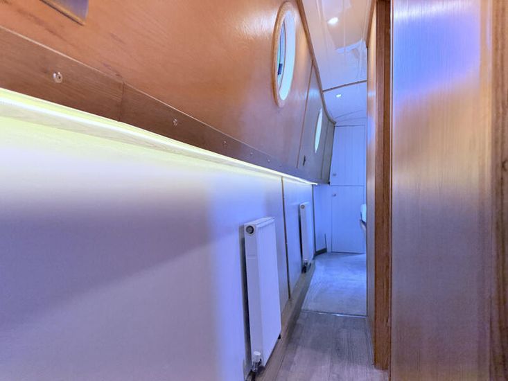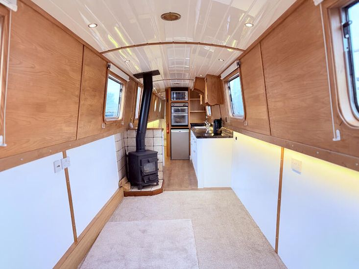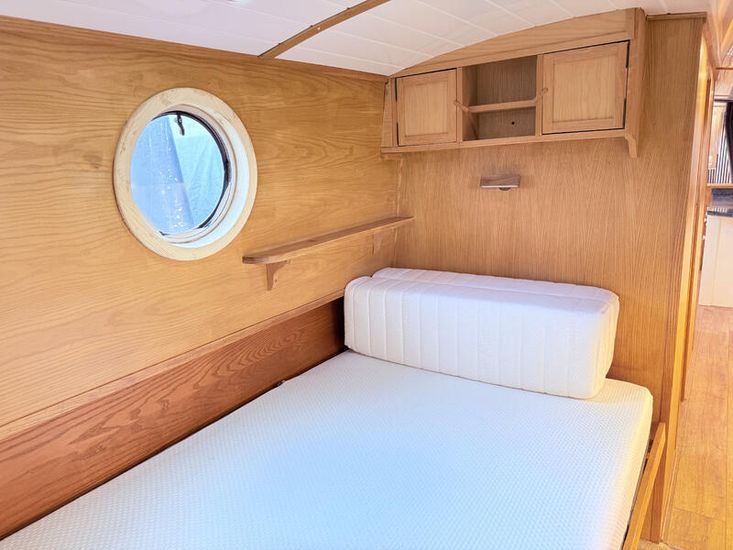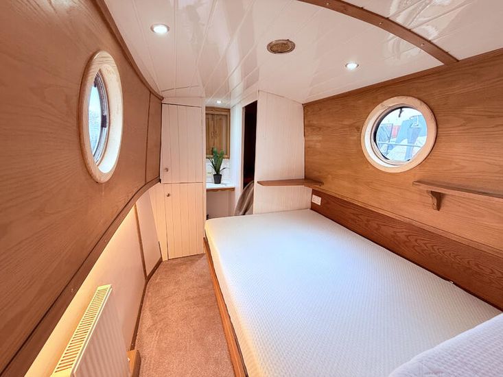 She is a reverse layout entering from the stern into the saloon. Onto a spacious open plan area with a Morso solid fuel stove which provides the heating and a cosy flame to sit by in the evenings or on cold winter days. This also provides heating throughout the vessel via three radiators. Leading on to a walkthrough galley fitted with all the means to liveaboard including a 12v Fridge, washing machine (in the saloon cupboard), oven, grill, and hob. Into an off-corridor shower room, with a large shower, a vanity basin, and a pump-out toilet. Finally, the master bedroom at the wraparound bow, giving you an enlarged space. The double bed is fitted with a slide out mechanism that makes the bed a king size. There is ample storage both under the bed and at the foot of the bed via floor-to-ceiling-sized wardrobe space either side of the bow hatch.