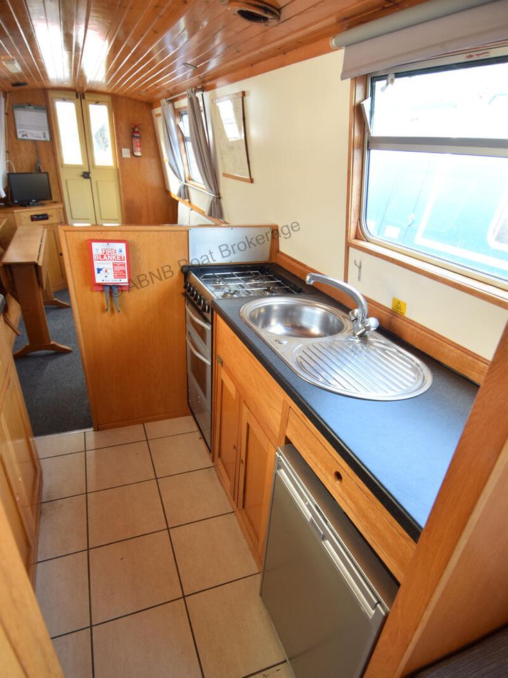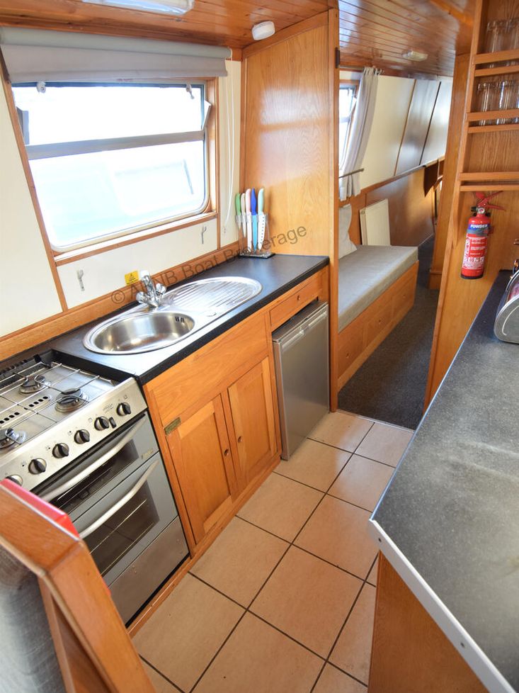 The adjoining galley includes gas cooking facilities, microwave and an under-counter fridge, with ample storage for longer trips.