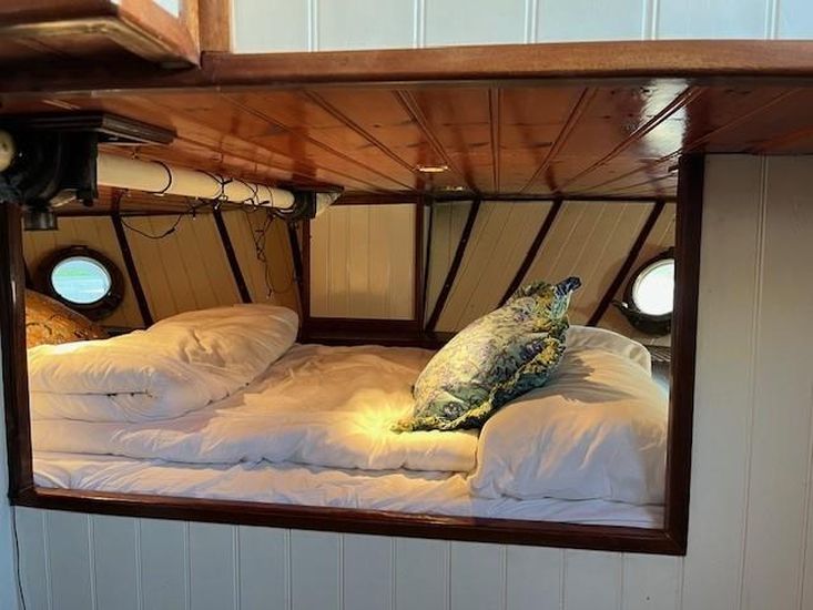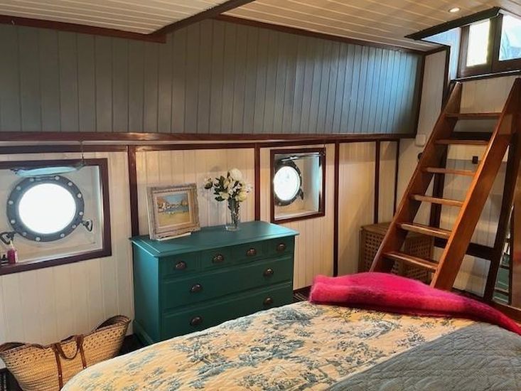 A Dutch dry goods sailing barge launched in 1901 in Mijdrecht, Netherlands. Brought to the UK in 1999 and converted to a high standard over almost 2 decades. She offers a full height, spacious comfortable home with many quality features and all modern appliances but with the added benefits of an off-grid river cruising life if desired. Hardwood floors and woodwork, vintage cast iron radiators, wood burners and a main saloon space cleverly divided by bespoke shelving units all contribute to a unique aesthetic.Â