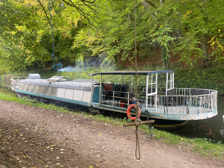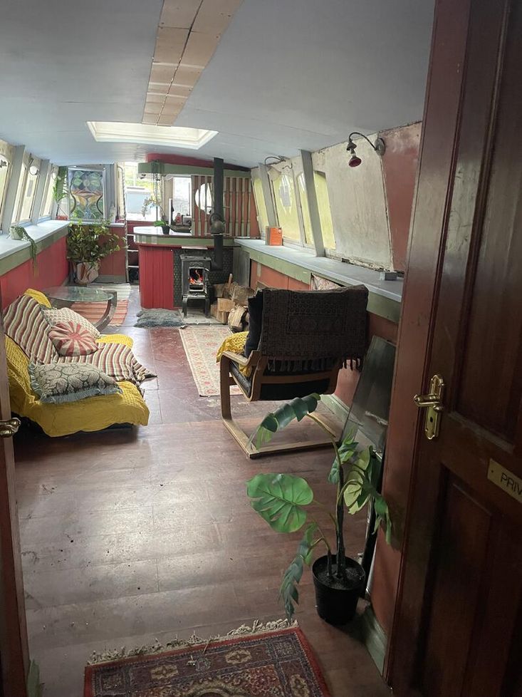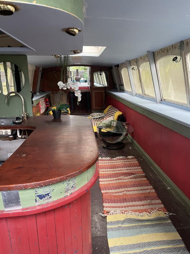 65ft widebeam with good commercial or residential potential, open plan interior with bar/kitchenette, sink, gas hob and wood burning stove.
