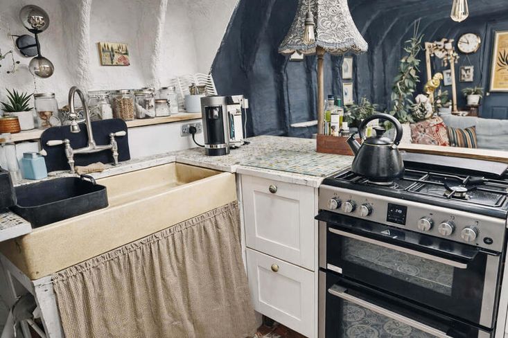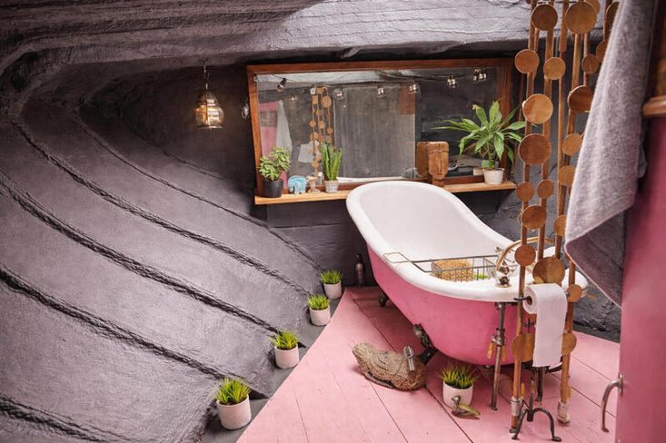 A door from the living space leads to a utility area housing the LPG boiler and washing machine, followed by a beautifully fitted bathroom with free-standing bath, separate shower, toilet, and hand basin.