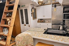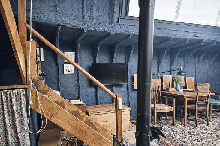 Entry is via the former wheelhouse, now serving as a bright and welcoming entrance. A wooden staircase leads down to the main living area, a wonderfully inviting space combining lounge, dining, and kitchen in an open-plan layout.
