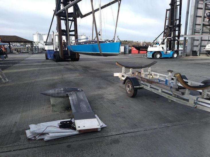 Lifting keel, using deck-stepped crane (with new winch). Keel bolted down for sailing. All faired for racing.
