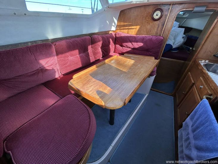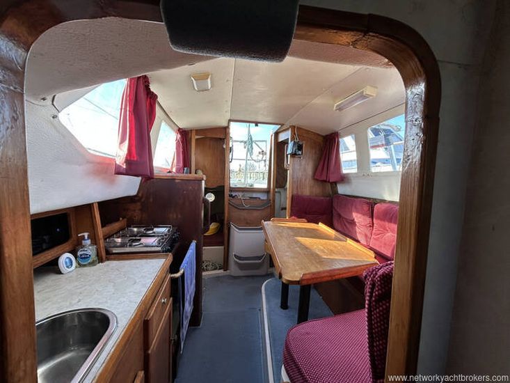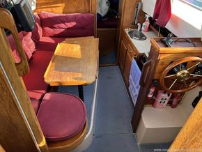 Descending the companionway, you are greeted by a bright and inviting saloon finished in classic teak joinery, enhanced by generous natural light from deck hatches and opening portlights. The main saloon features two comfortable settees with a central folding table, creating a sociable dining area that easily converts into an additional double berth when required.
