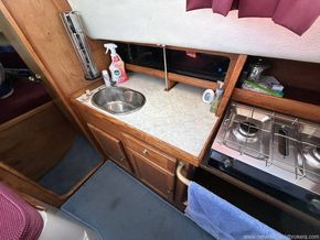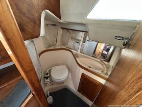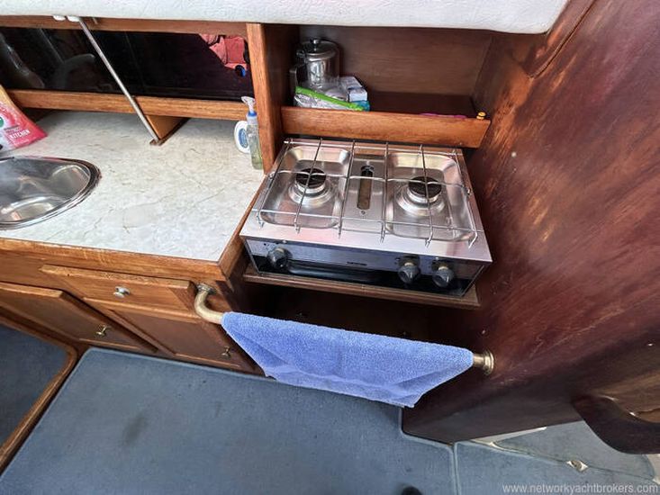 The practical galley to starboard is well equipped with a two-burner gas hob, stainless steel sink with pressurised hot and cold water, coolbox and excellent stowage, making onboard catering a pleasure. Hot water is provided via a calorifer tank heated by the engine and a 240v immersion heater.