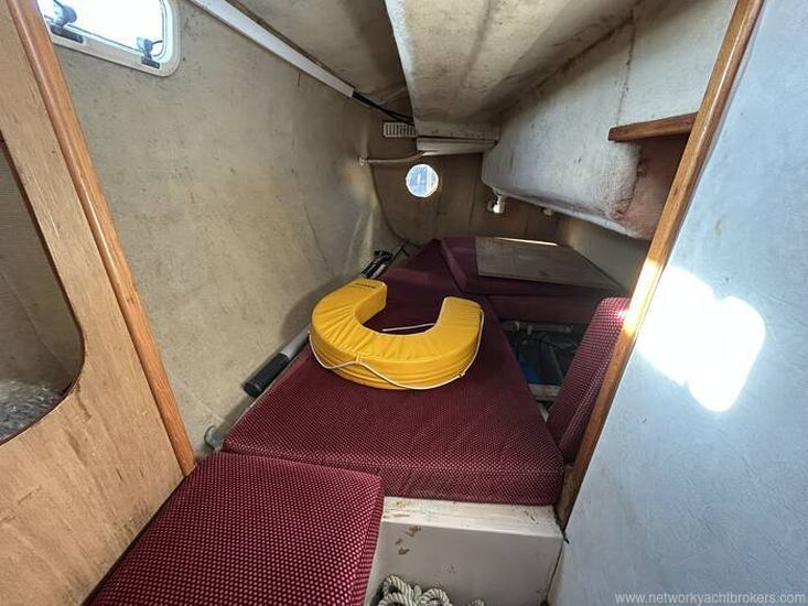 Forward is a superb V-berth cabin with infill, forming a large double sleeping area, complete with storage shelving and hanging space — a peaceful retreat for owners or guests.