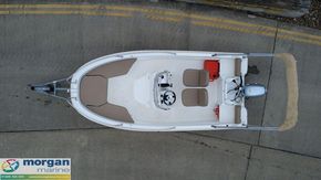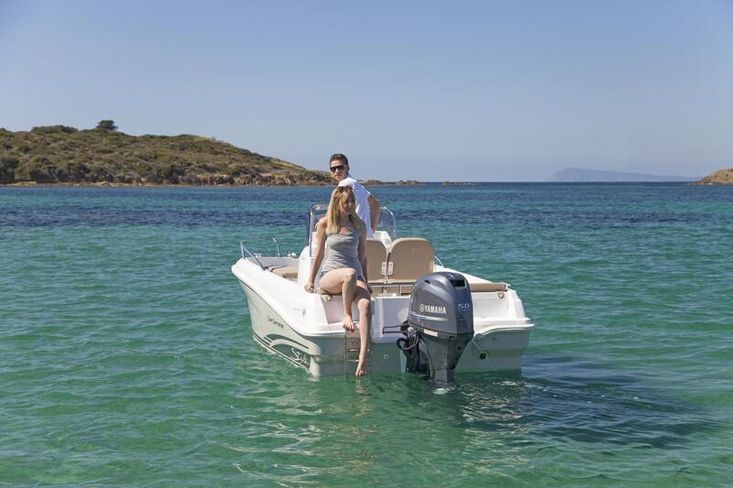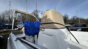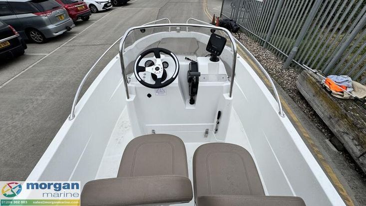Console with windscreen, handrail and forward seat. Dash with engine controls. Self draining cockpit. Aft cockpit seating with backrest cushions. Pilot and co-pilot seat covers. Handrails. Pilot and co-pilot seats. Bow C-shaped removable cushioned seating. Bow locker. Manual bilge pump.