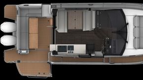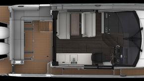 Deck: Electric folding terrace on starboard side. Port side boarding door for easy access to moorings. Electric windlass with anchor and rode in self draining anchor locker + bow roller - with control from helm. Mooring kit: 4x mooring lines (diameter: 16 / length: 12000), 4x fenders (635 x 200). Anchoring kit: anchor – 16kg, chain - 10mm / 28m, cable - 18mm / 40m. Aft cockpit sliding bench forming U-shape saloon with cushions and backrest - convertible into sun lounger + wooden table and sunpad cushion. Deck locker with ladder. 2x forward / 2x aft / 2x midship mooring cleats. Open front pulpits and cockpit handrails. Self draining cockpit. Starboard side cockpit barrier to swim platforms. Cockpit shower (hot & cold water). Hull rubrail. Wide and deep starboard side deck for safe access to wheelhouse helm door and bow. Aft cockpit sun awning + closing canopy – graphite. Bow cockpit with lounger chairs + cushion. Linedeck throughout boat.