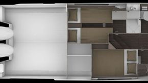 Cabin: Forward cabin with extendable double berth with premium mattress and storage under + headband cushion, roof hatch, hull + deck windows + opening porthole, overhead lockers + shelves + storage, Ambiance LED lighting + reading lights + sockets. Portside cabin with premium mattress - 2x single berths (with double berth complement) + storage under + headboard, seat, locker + storage and bedside table, LED lights + socket. 3rd cabin with LED lights, locker, premium mattress, locker, opening porthole, plus additional 80L fridge. Separate toilet compartment with electric toilet, washbasin, Corian countertop, opening porthole and separate shower. Separate access to the head compartment from the main cabin. Full height mirror in steps down from wheelhouse. Double berth complement in saloon.