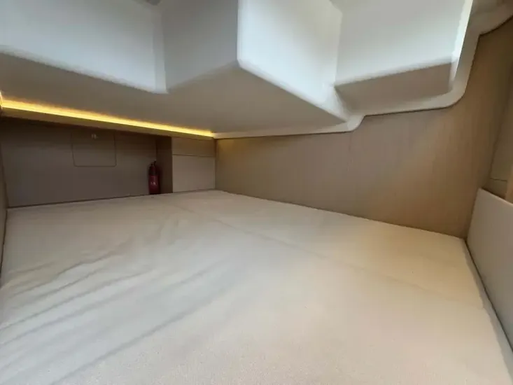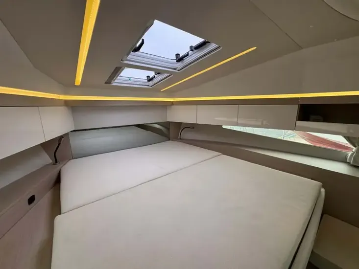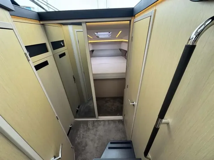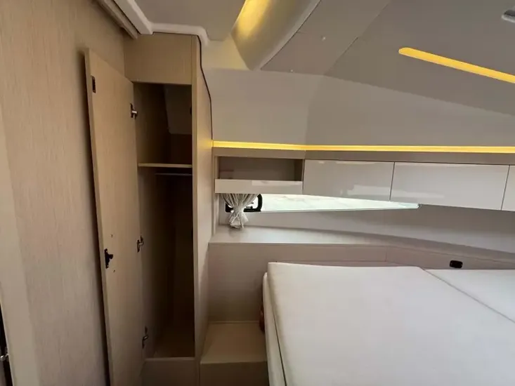 - At the bow is the very modern double v berth cabin with overhead storage and wardrobe