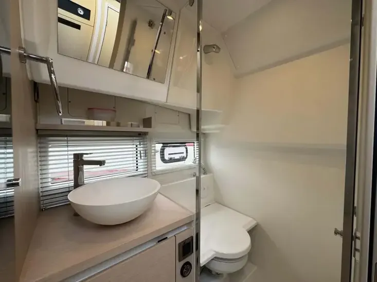 - Opposite is the day heads, with electric heads, fresh water sink, storage and stand up shower