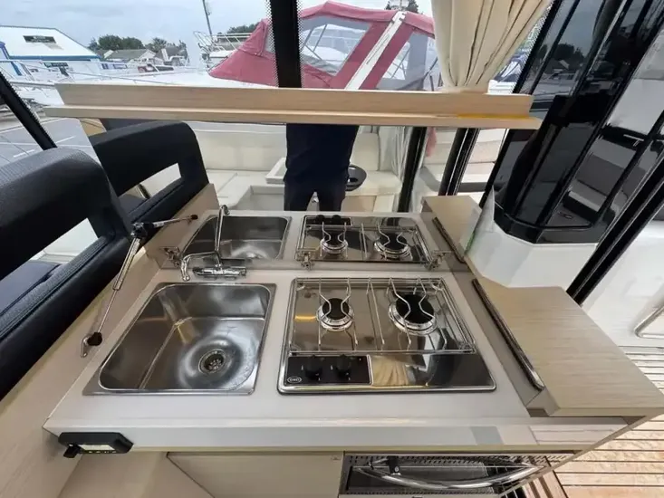 - Starboard side galley area with fridge, freshwater sink, 2 burner hob and oven