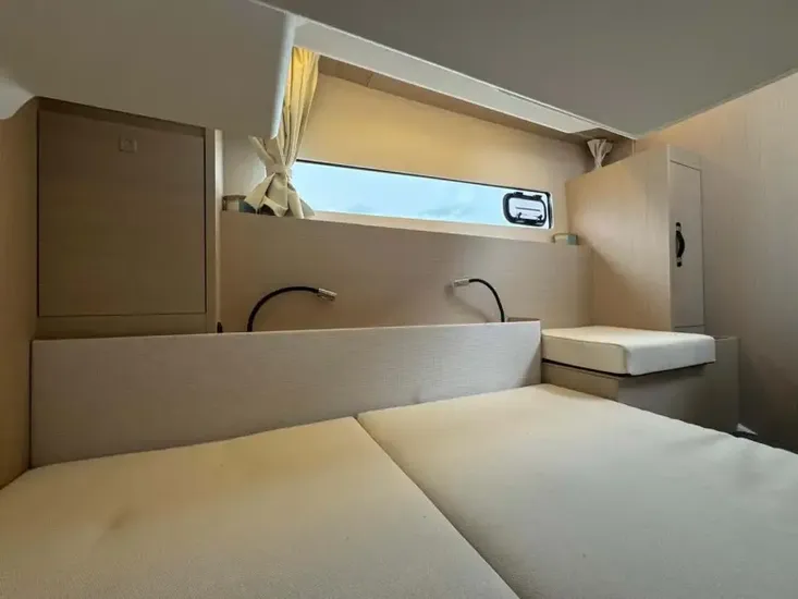 - Immediately to port is the very good size mid ships double berth cabin, with storage and additional seat